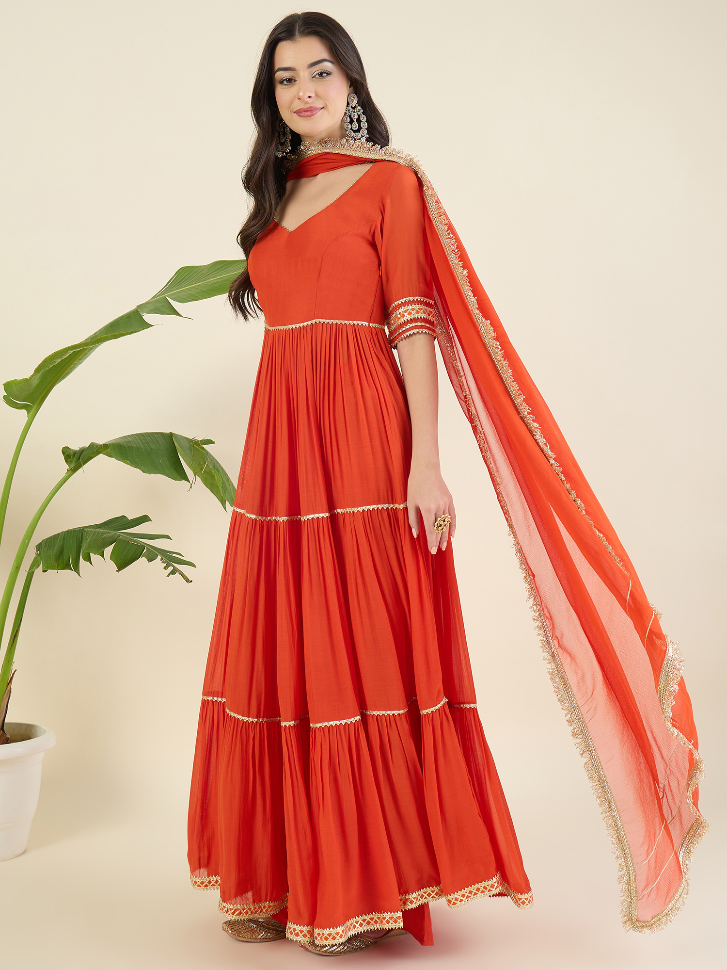 Women Tiered Gotta Patti Chanderi Cotton Kurta with Palazzos & With Dupatta