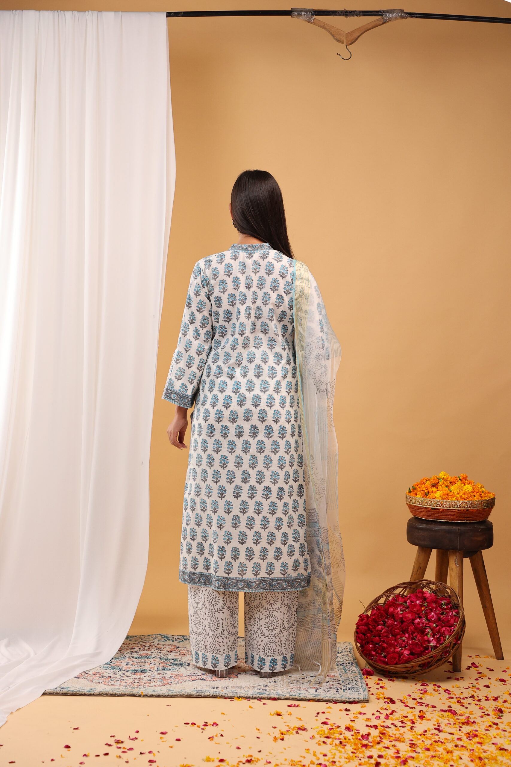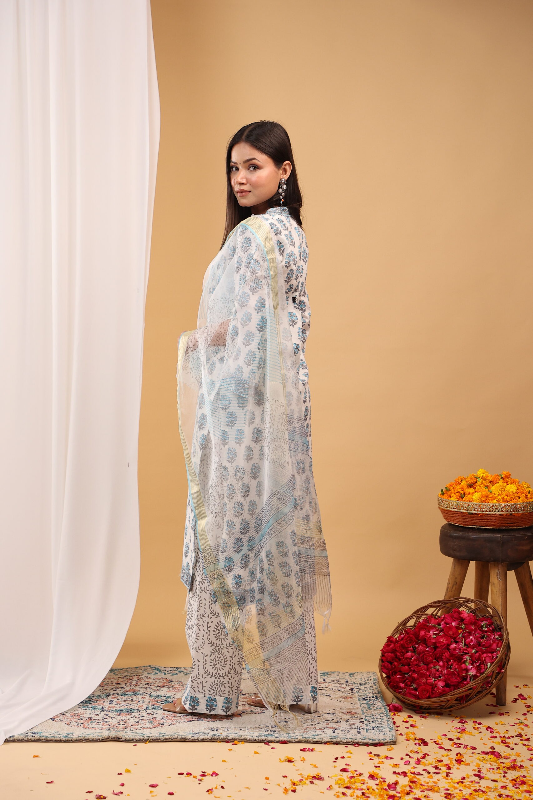 Kurta: A straight-cut kurta featuring a notched V-neckline adorned with white lace trim. It is decorated with intricate blue floral block prints and matching lace-trimmed cuffs.