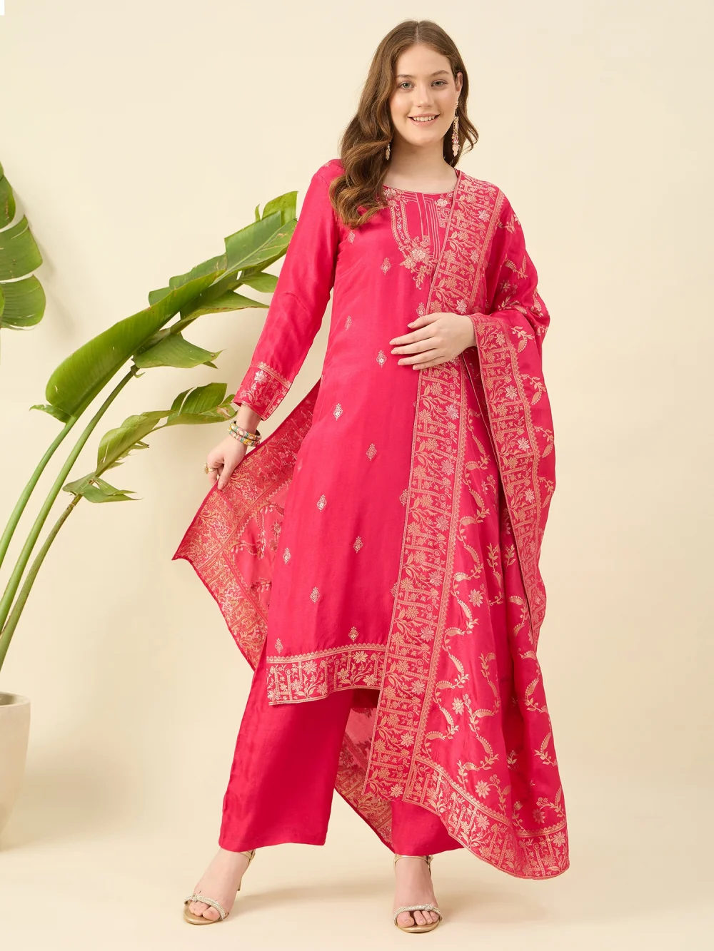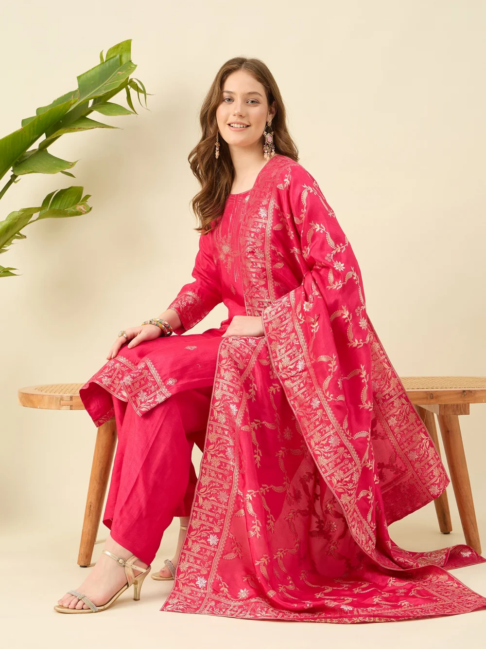 This magenta kurta set in Banarasi silk features intricate woven motifs that celebrate timeless craftsmanship. The rich hue and lustrous fabric make it perfect for festive gatherings and special occasions—a statement of grace and grandeur, rooted in cultural heritage.