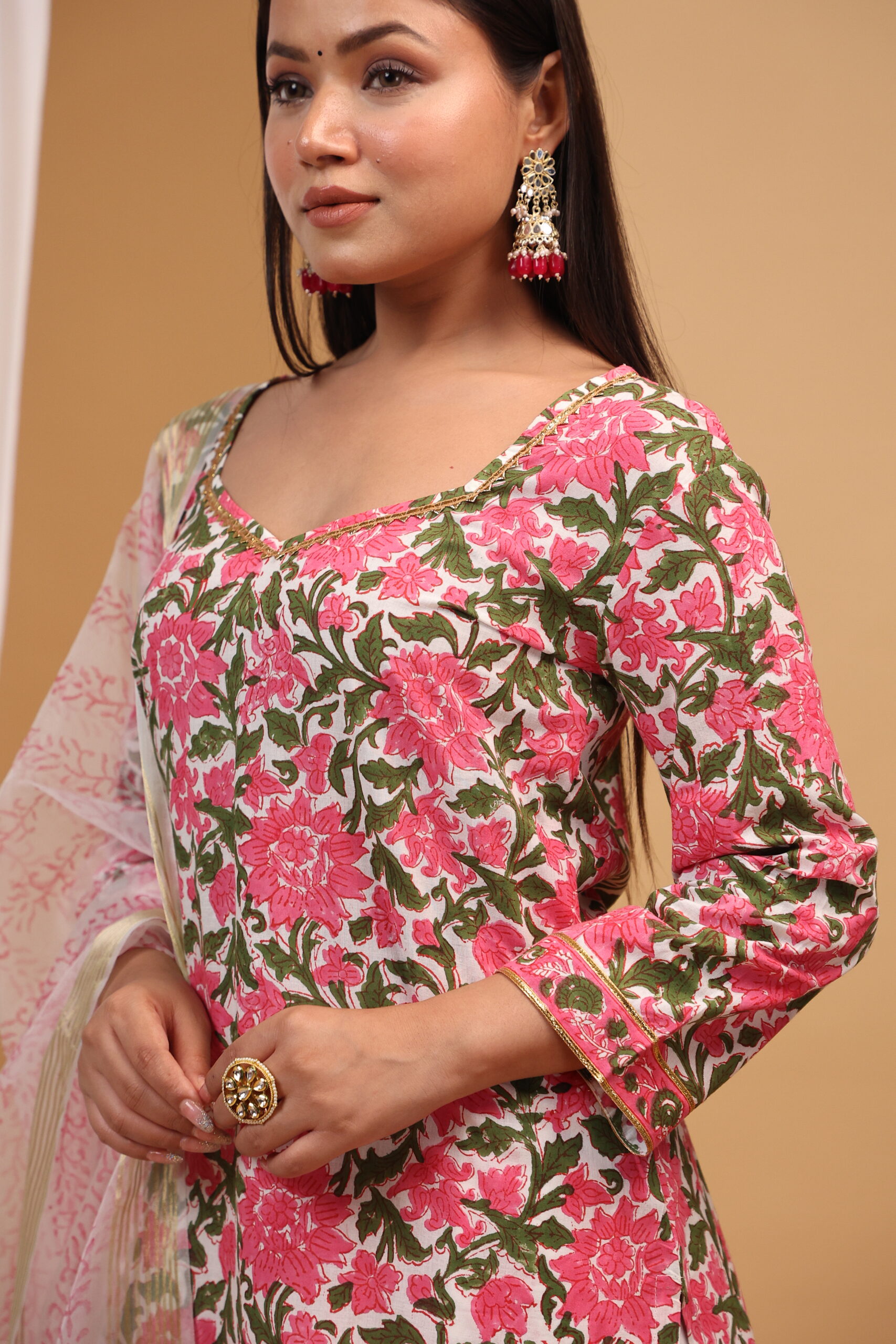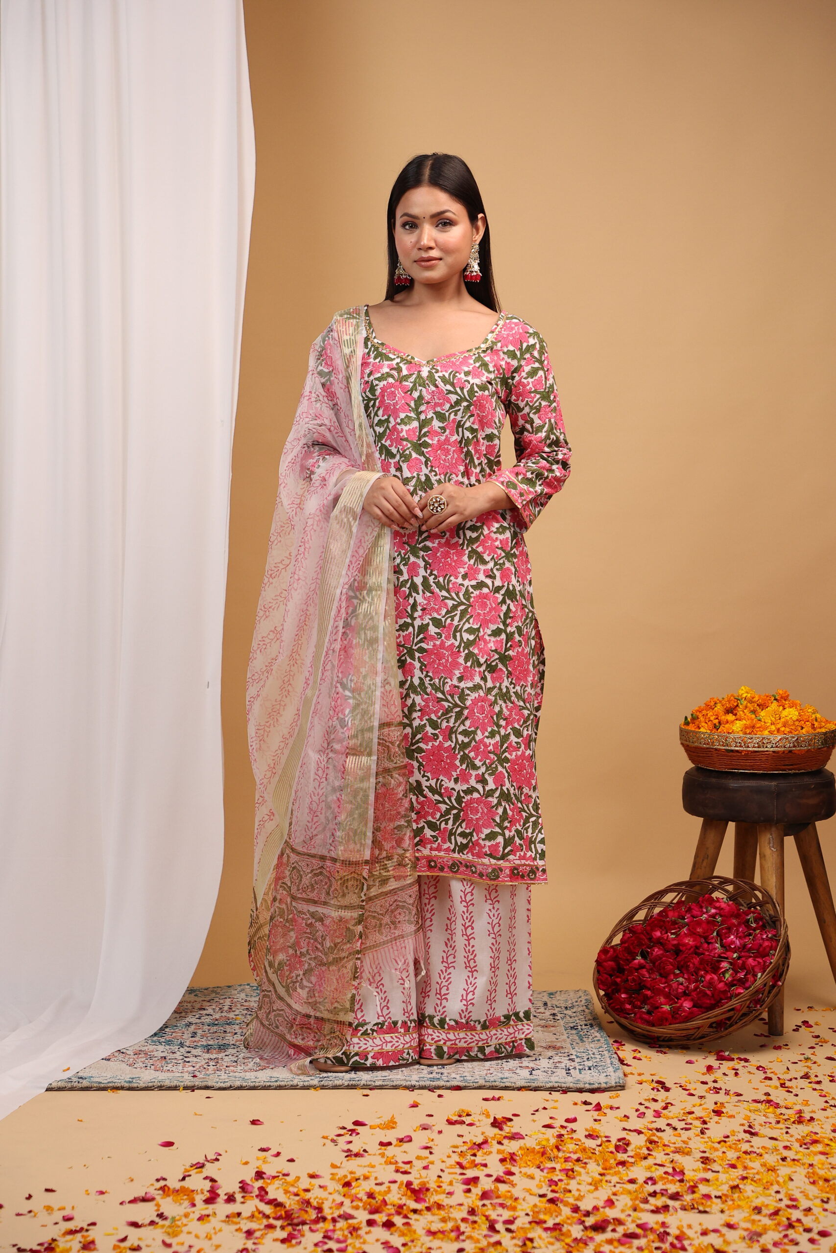 Step into effortless elegance with this beautifully crafted floral printed kurta set. Designed in a soft blush pink base with vibrant rose motifs and subtle green foliage, this ensemble perfectly blends traditional charm with modern grace.