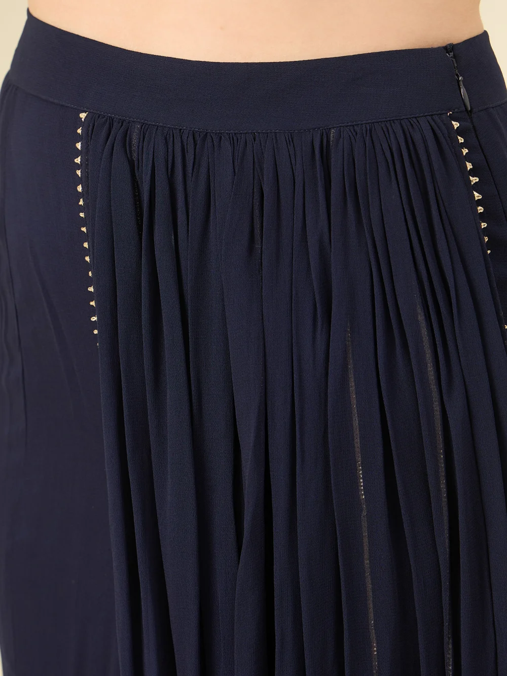 Navy blue solid ready to wear lehenga, has zip closure, asymmetric hem