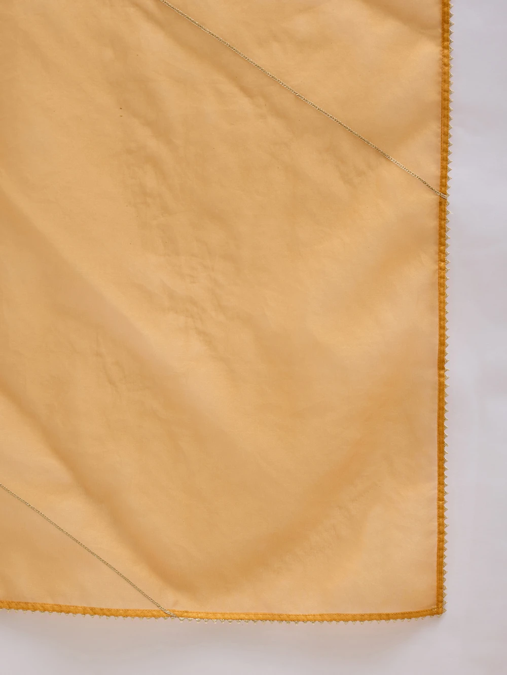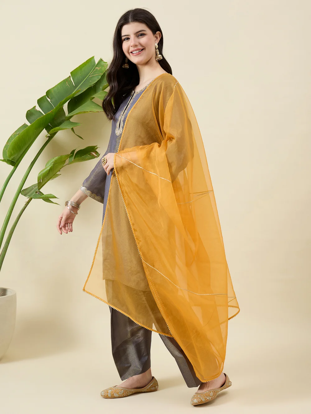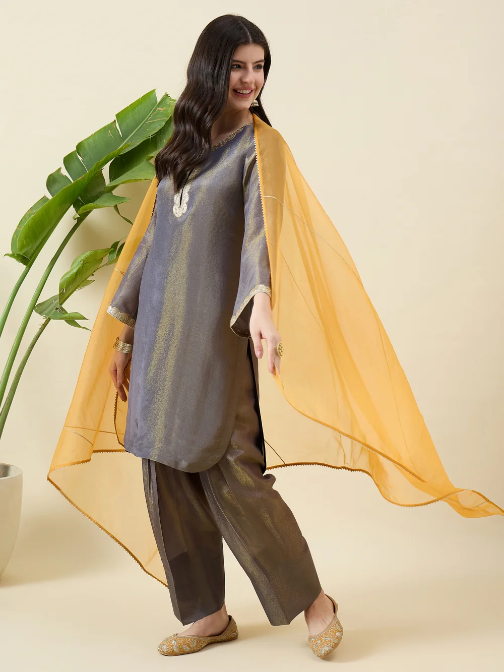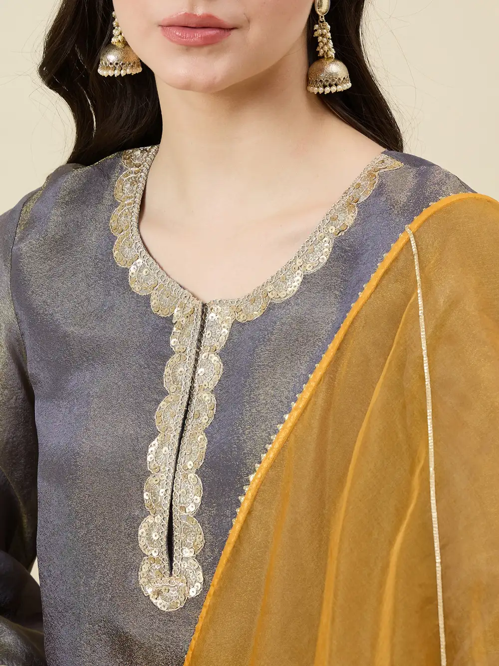 Grey, gold-toned and yellow embroidered kurta with trousers and dupatta