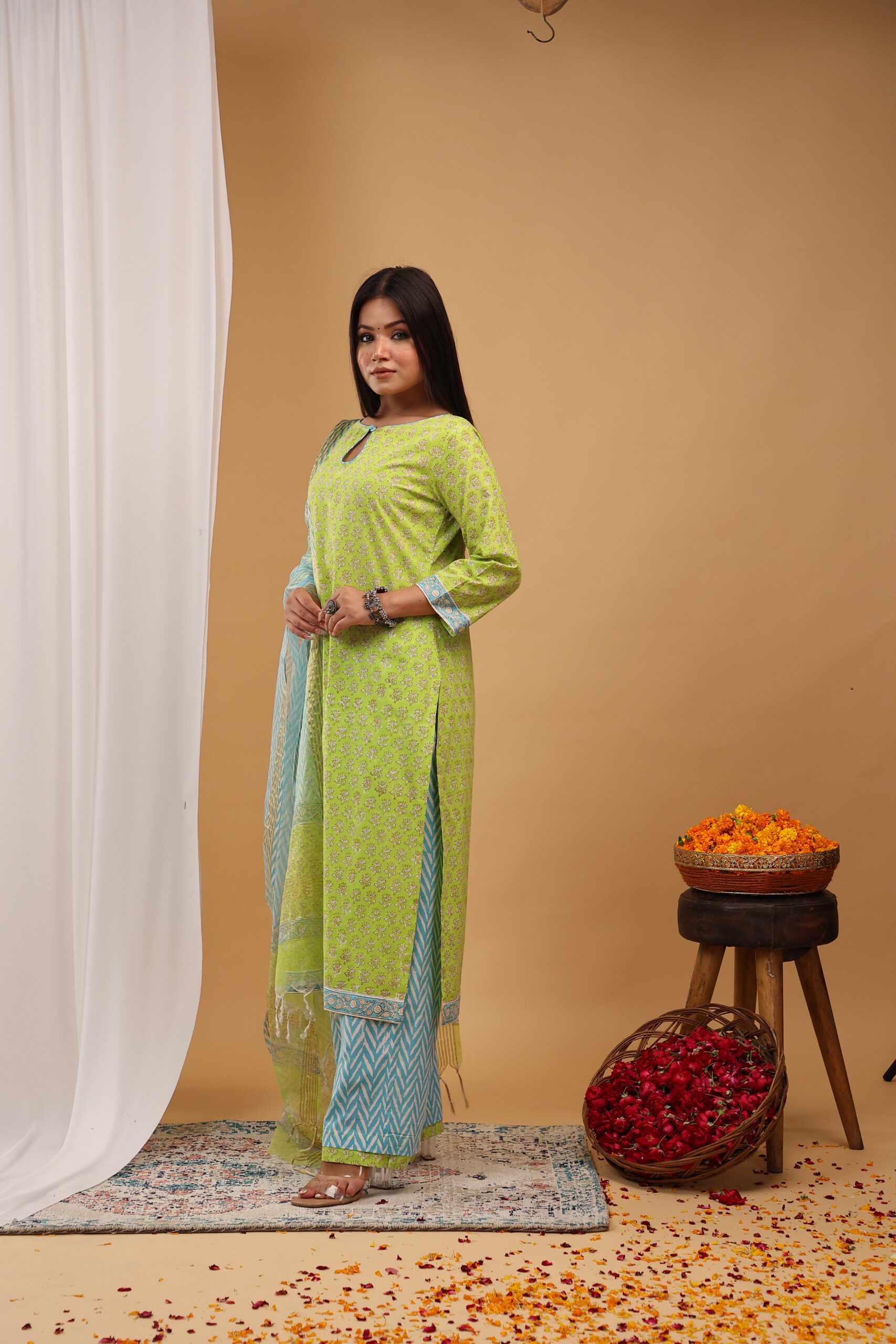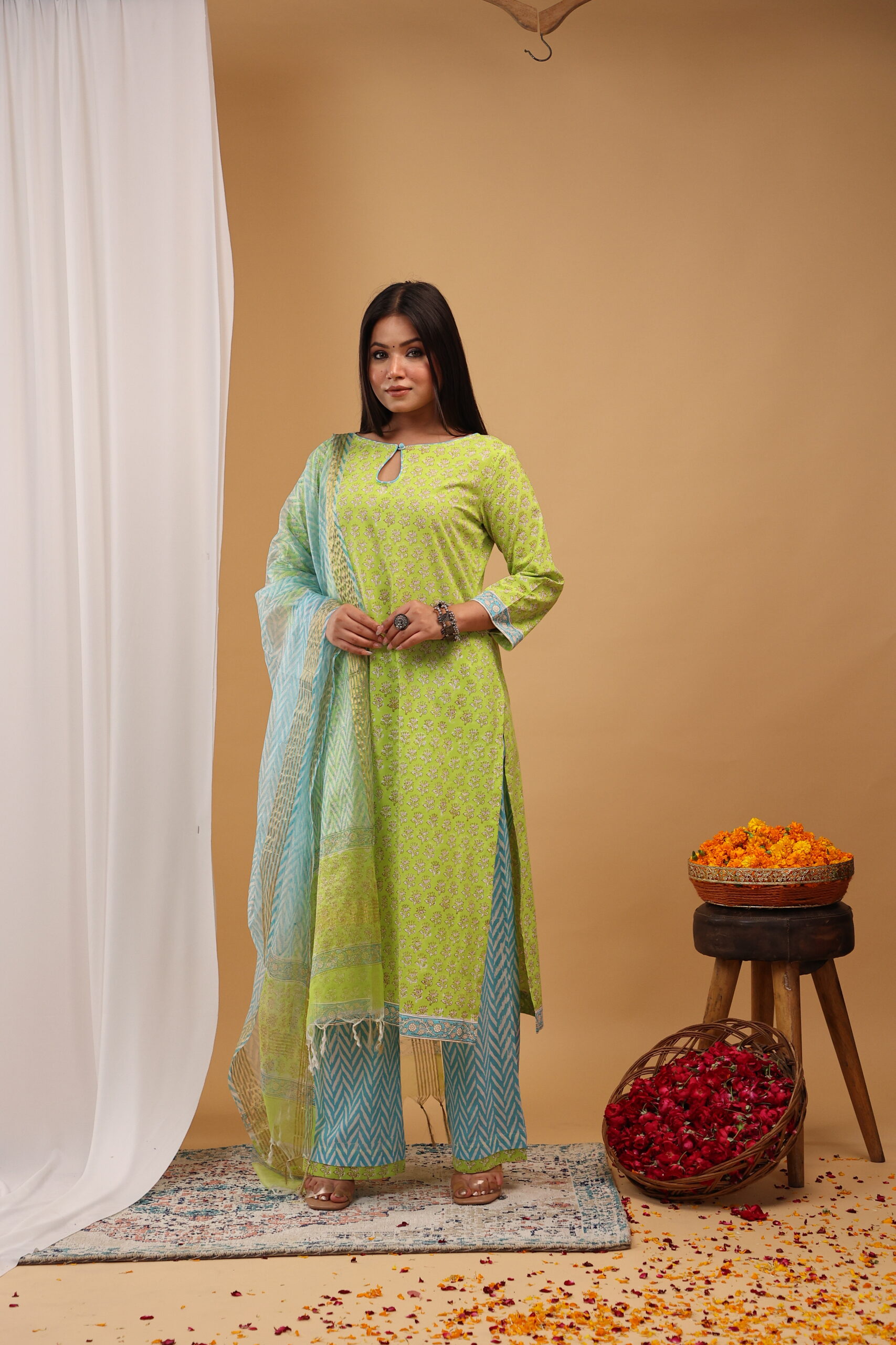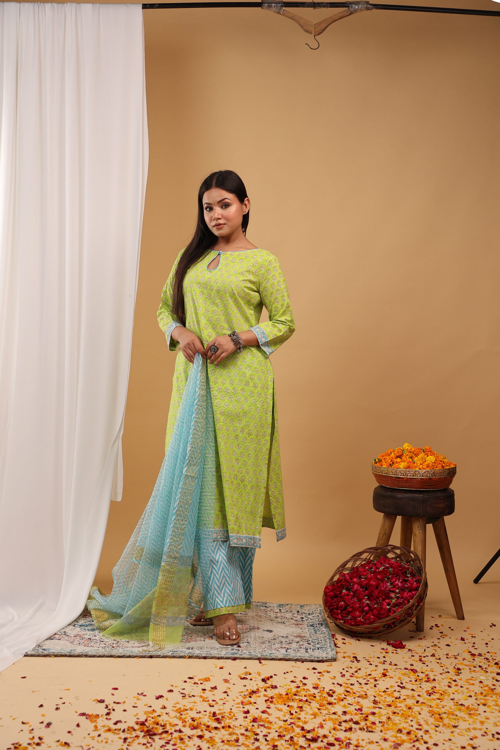 Add a refreshing pop of colour to your ethnic collection with this Lime Breeze Kurta Set, crafted in vibrant hues and delicate traditional prints for a lively festive look.