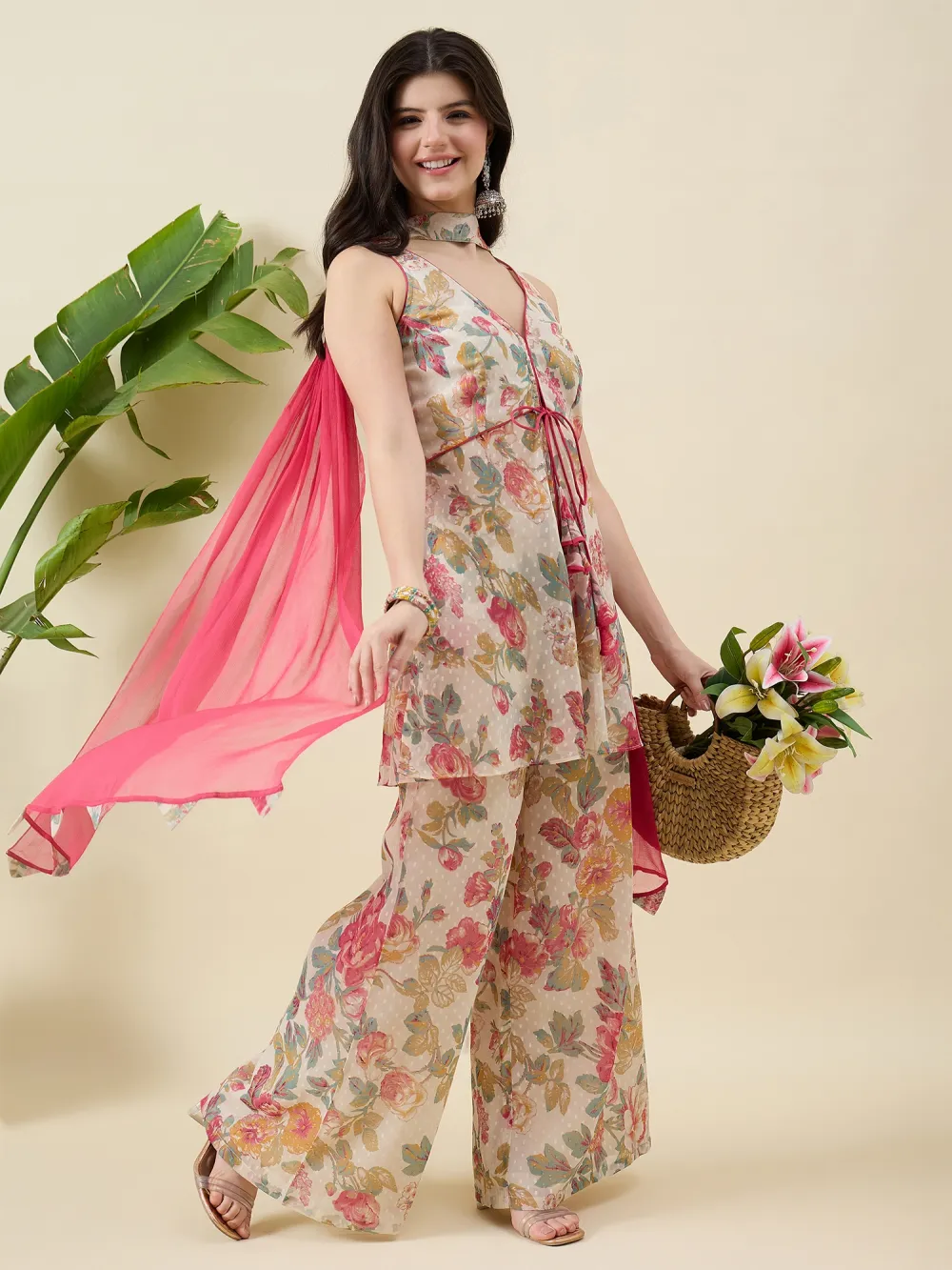 Printed Beige Kurta with Palazzo and Dupatta Set