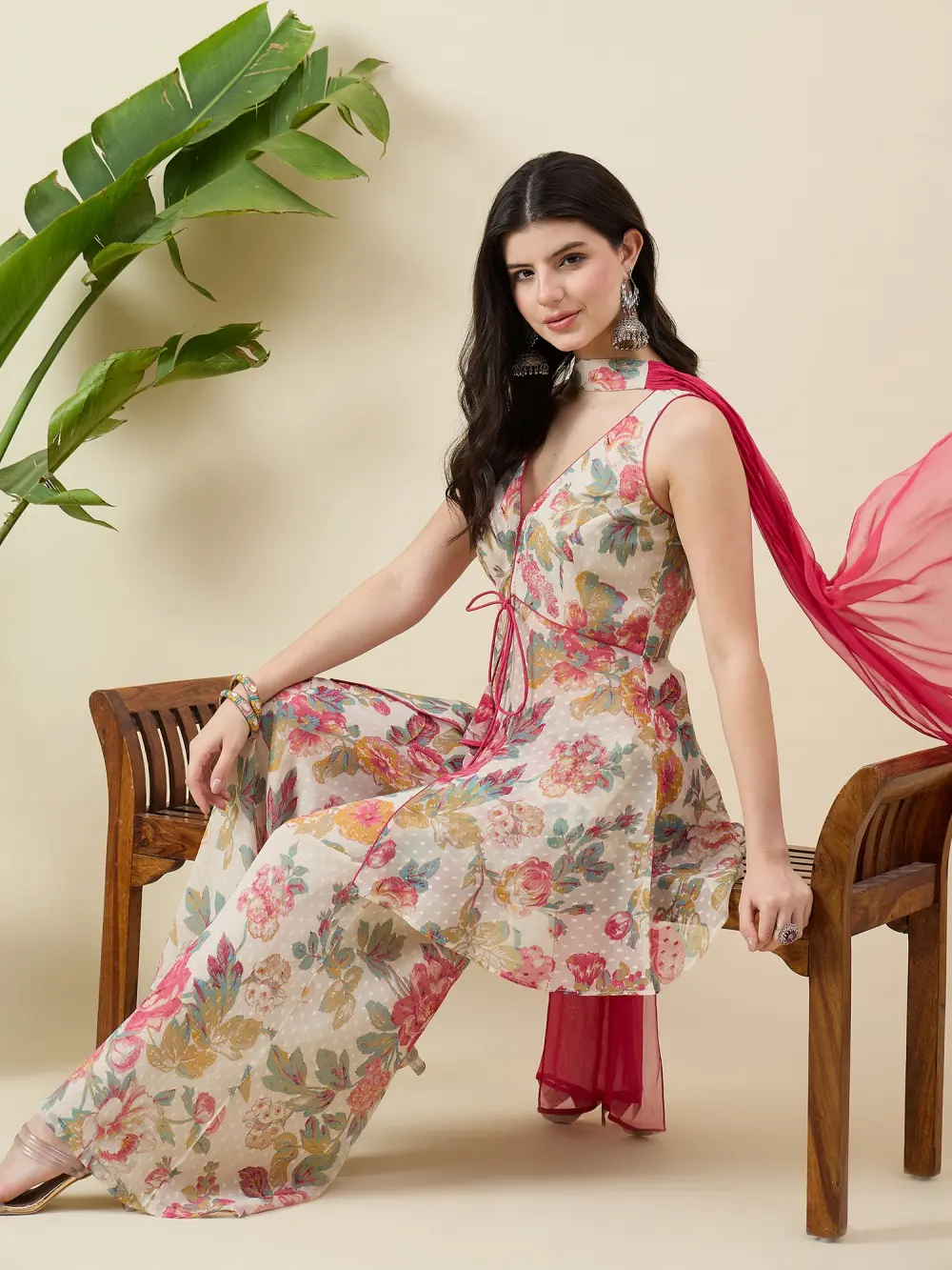 Beige Kurta Set in georgette features vibrant multicolour floral prints. Paired with a flowing palazzo and contrast dupatta, this ensemble blends lightness with charm. Perfect for daytime festivities or garden gatherings, it brings a graceful, contemporary touch to traditional style.
