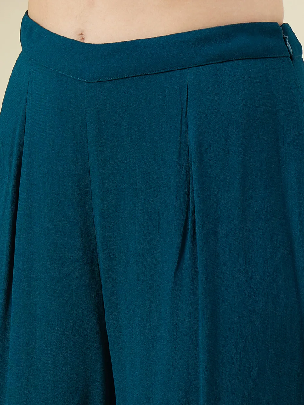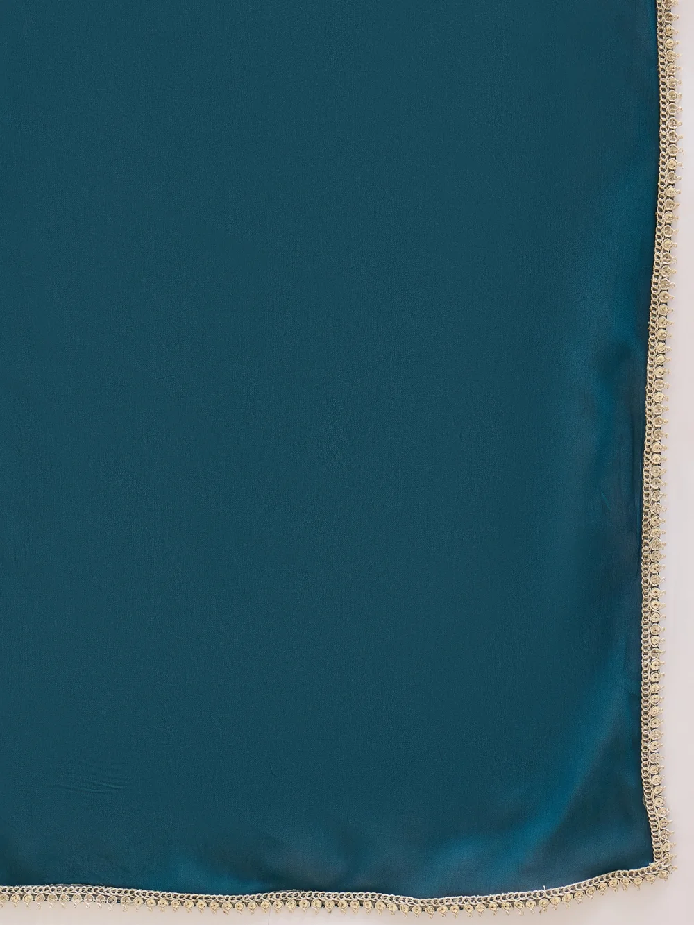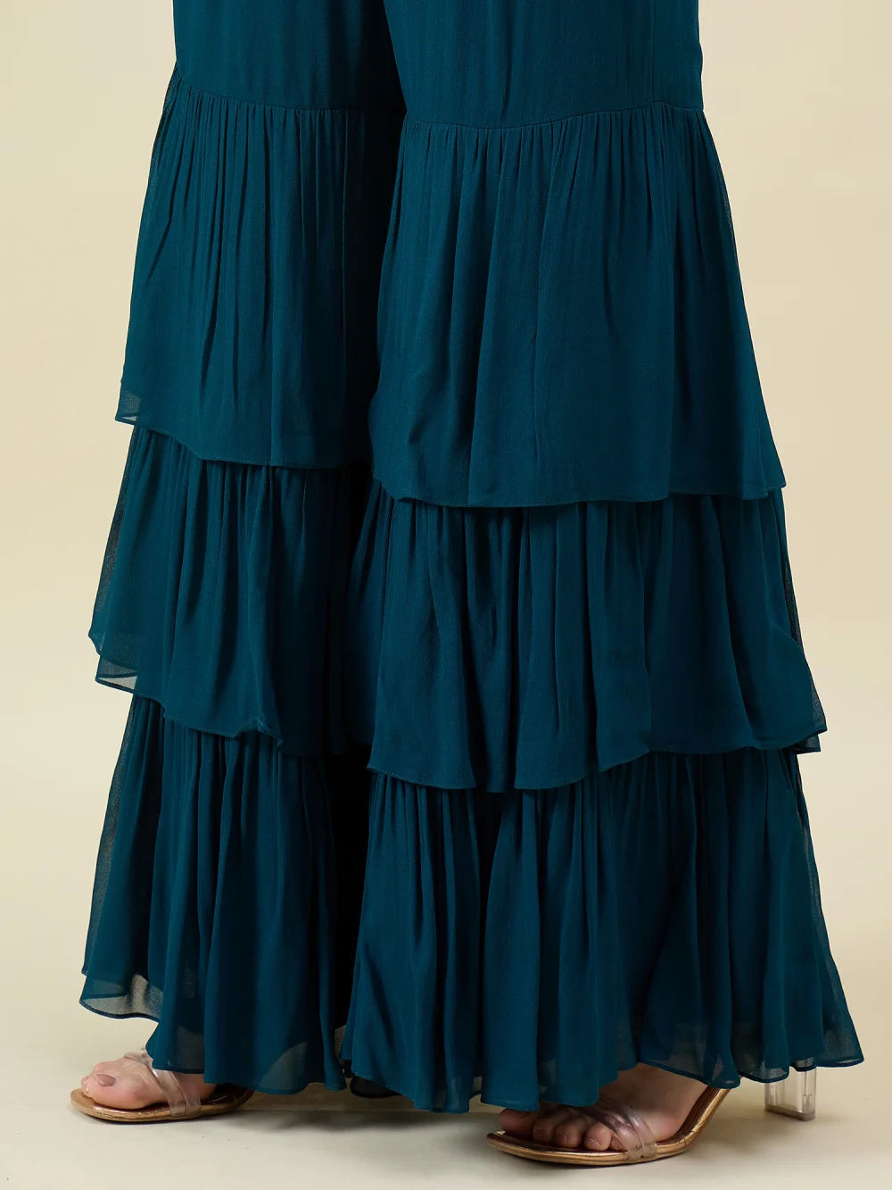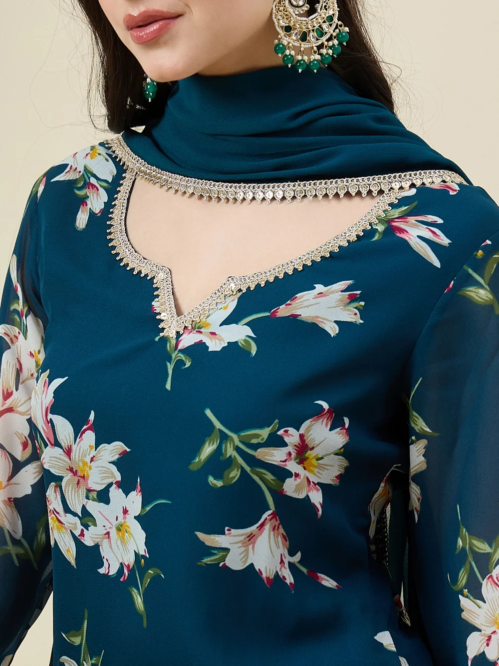 Blue Kurta and Sharara Set in georgette features delicate floral prints and elegant lace detailing. The lightweight fabric flows beautifully, while the sharara adds a playful charm. Perfect for festive occasions, this ensemble blends tradition with a soft, contemporary aesthetic.