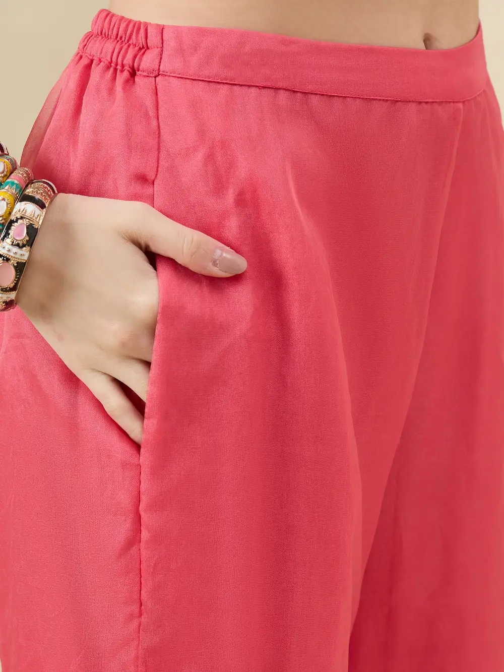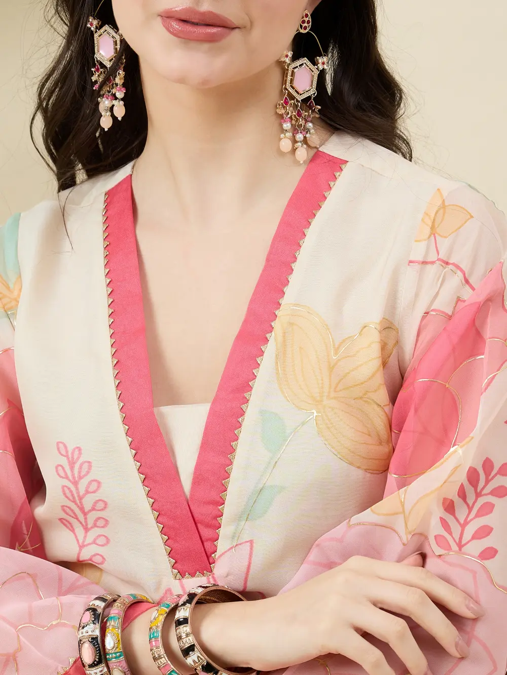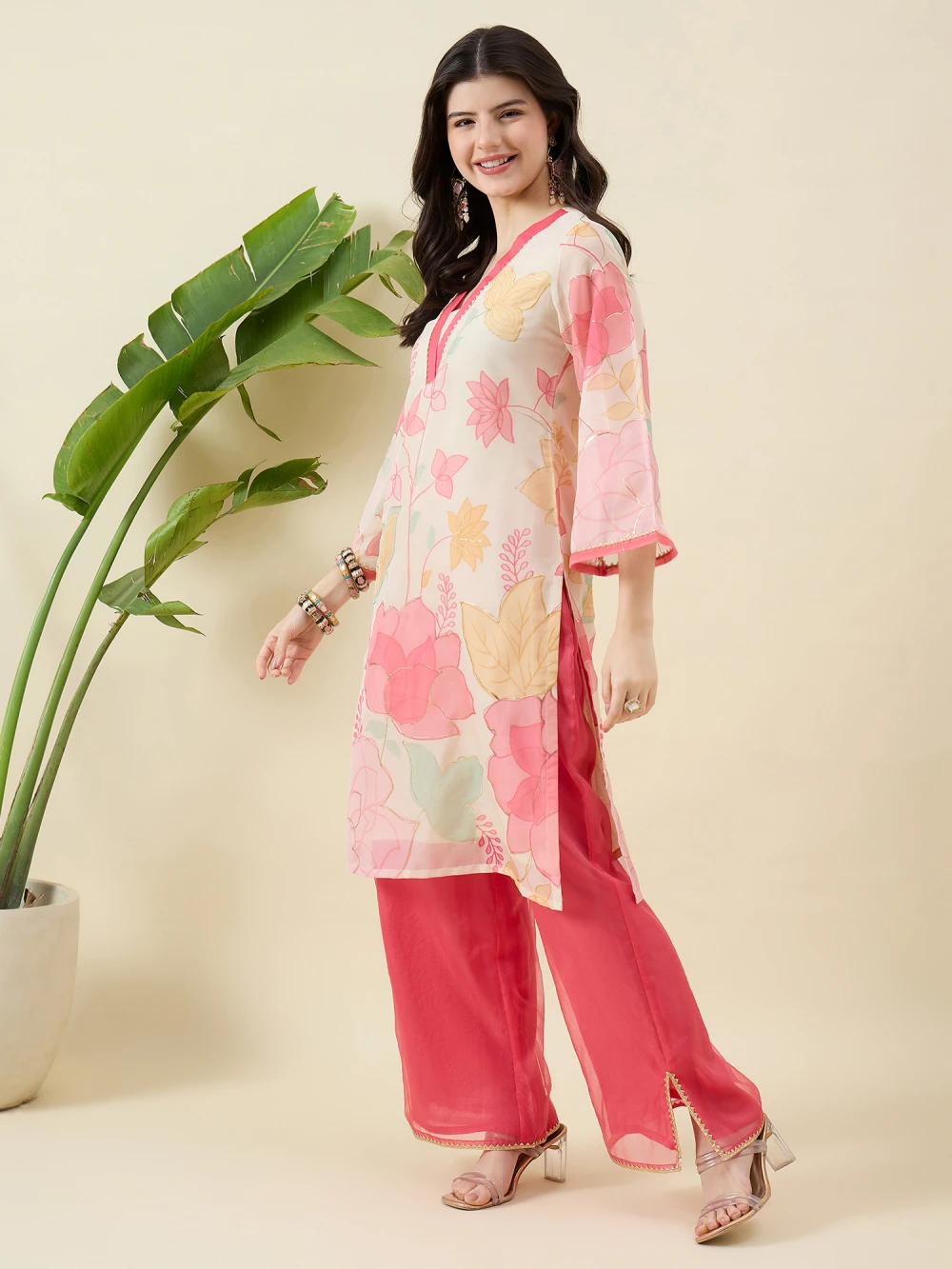 Beige & Pink Printed Kurta with Trousers