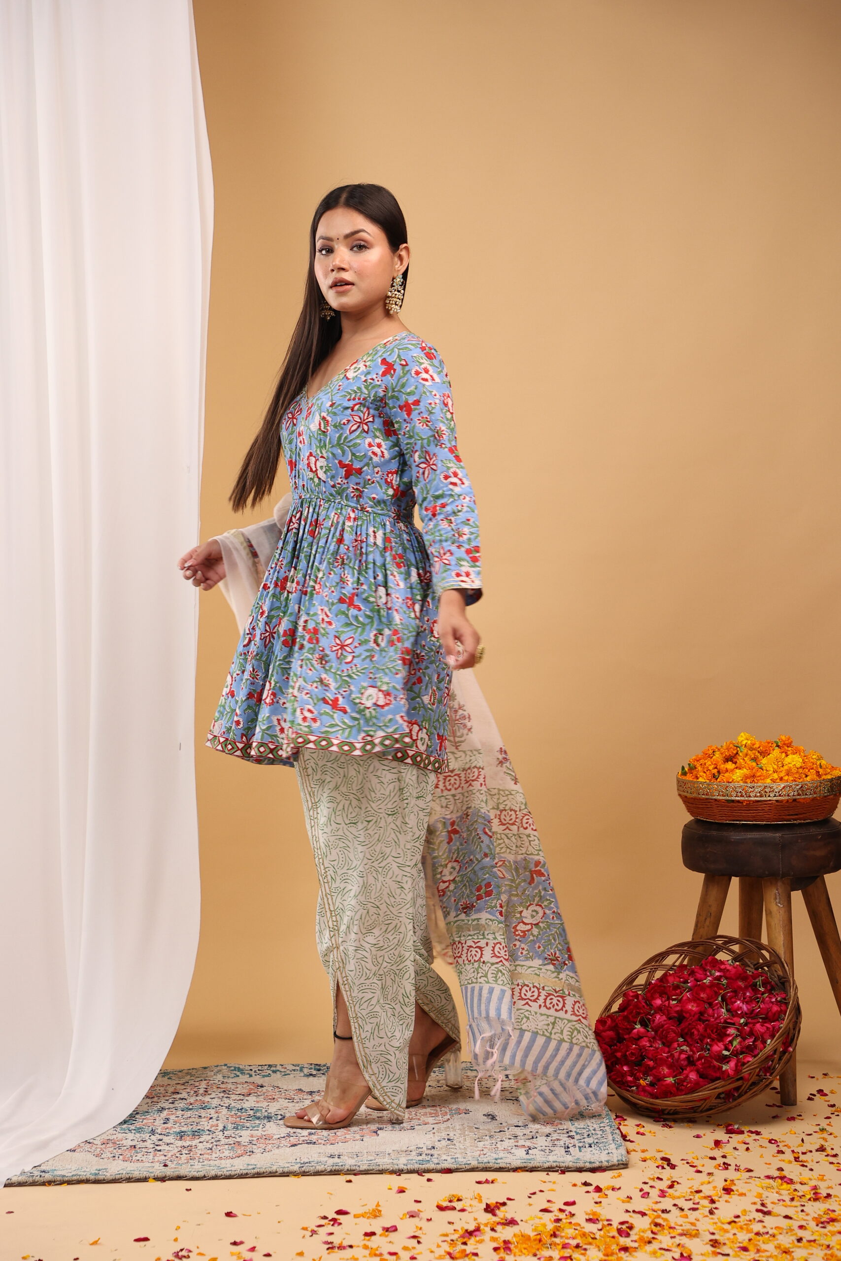 Refresh your festive wardrobe with this vibrant sky-blue floral kurta set, crafted to offer a perfect blend of elegance and comfort. Featuring lively floral prints with subtle border accents, this ensemble is ideal for daytime celebrations and graceful gatherings.