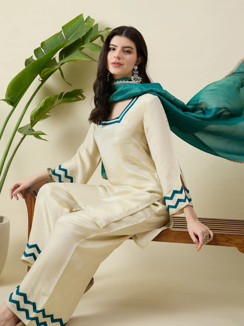 Cream & Green Solid Kurta with Trousers & Dupatta