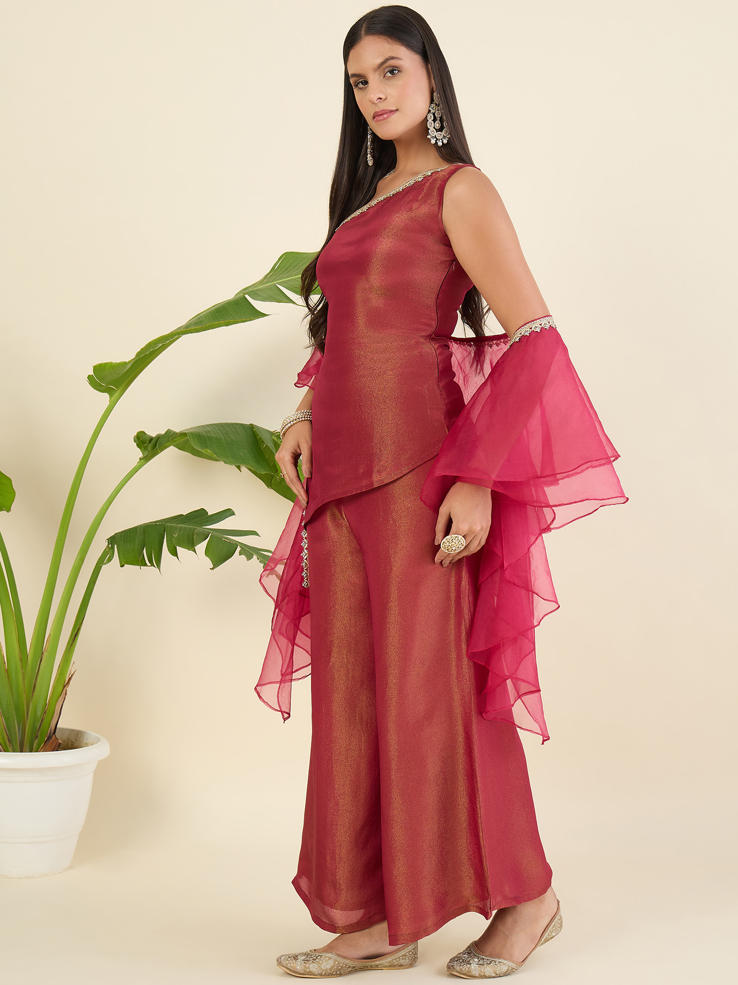 Maroon woven design Top with Palazzos with dupatta