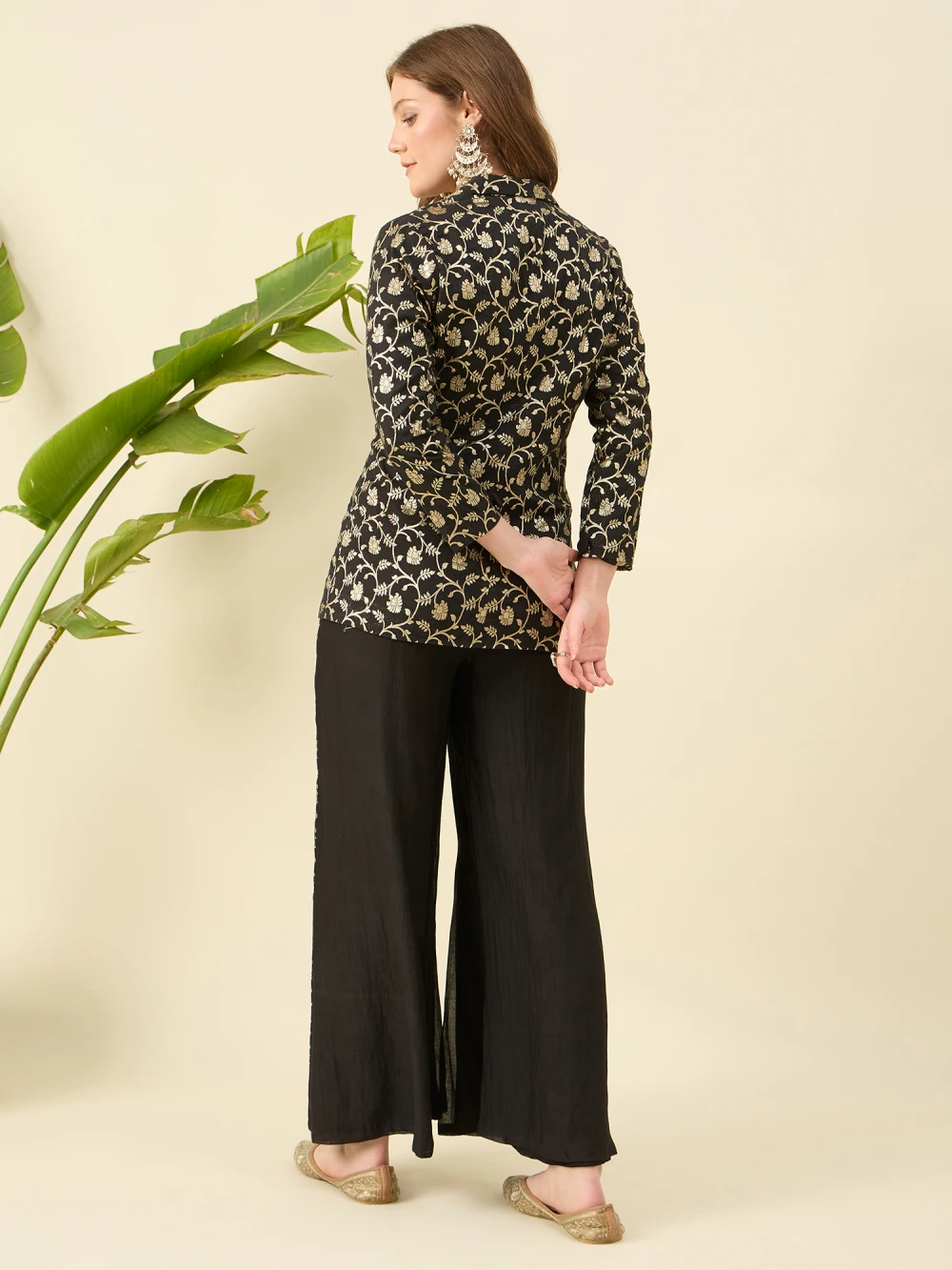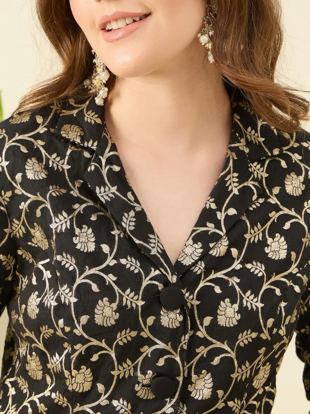 Black woven-designed top has a V collar neck and long sleeves, secured with slip on closure